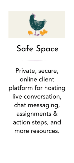 All of our work together happens in my private, secure, online client platform. It hosts our Zoom conversations (with cameras on or off per your preference); our chat messaging; assignments & next-step practices; and a range of additional resources you can explore to support yourself at any time.