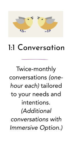 - One-to-one private, virtual conversations twice monthly, after an initial 75-90 minute in-depth Intention-Setting & Orientation session. The Immersive Option includes additional momentum-building conversations early on and at mid-point for deeper support and progress.