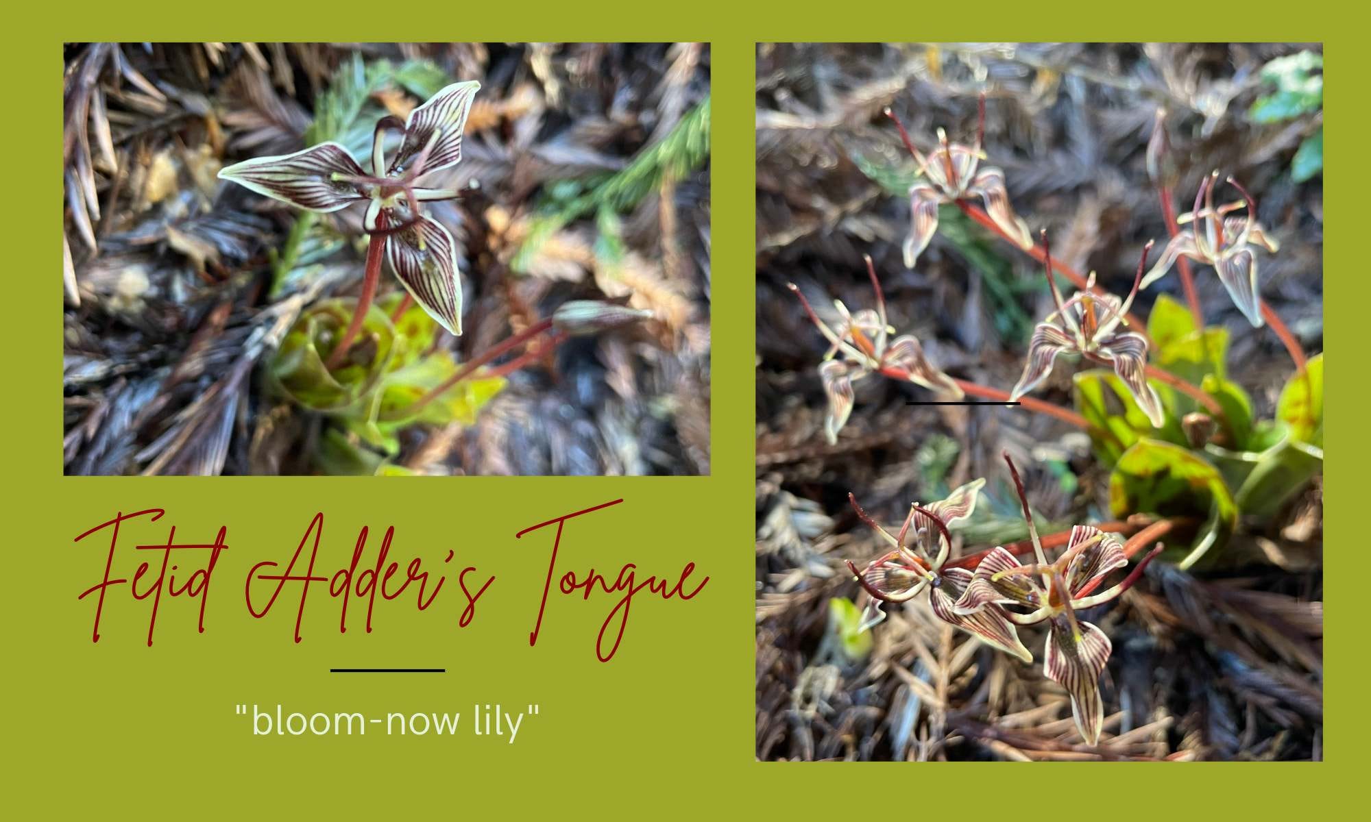 What thief takes a tiny wild lily? Fetid Adder’s Tongue—such an ominous name for a native forest flower that’s elegant and obscure, though not threatened, at least for now.